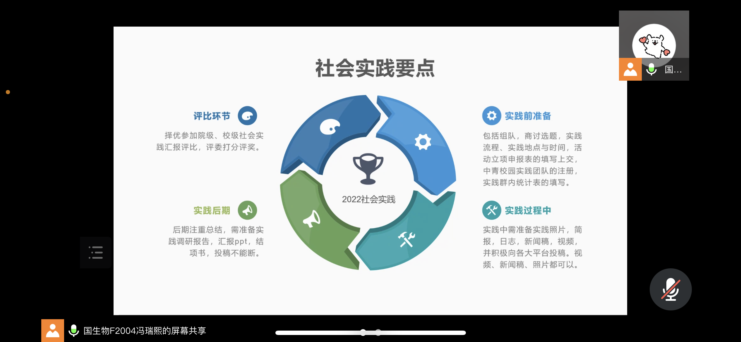 院学生会创新实践部冯瑞熙同学结合PPT对社会实践过程、调研报告撰写、宣传报道等多方面进行了经验交流。21年优秀实践团队代表李怡磊同学从活动的准备、过程、成果三个角度详细讲解了实践团队成长的过程,为大家提供了具有启发性的活动思路。