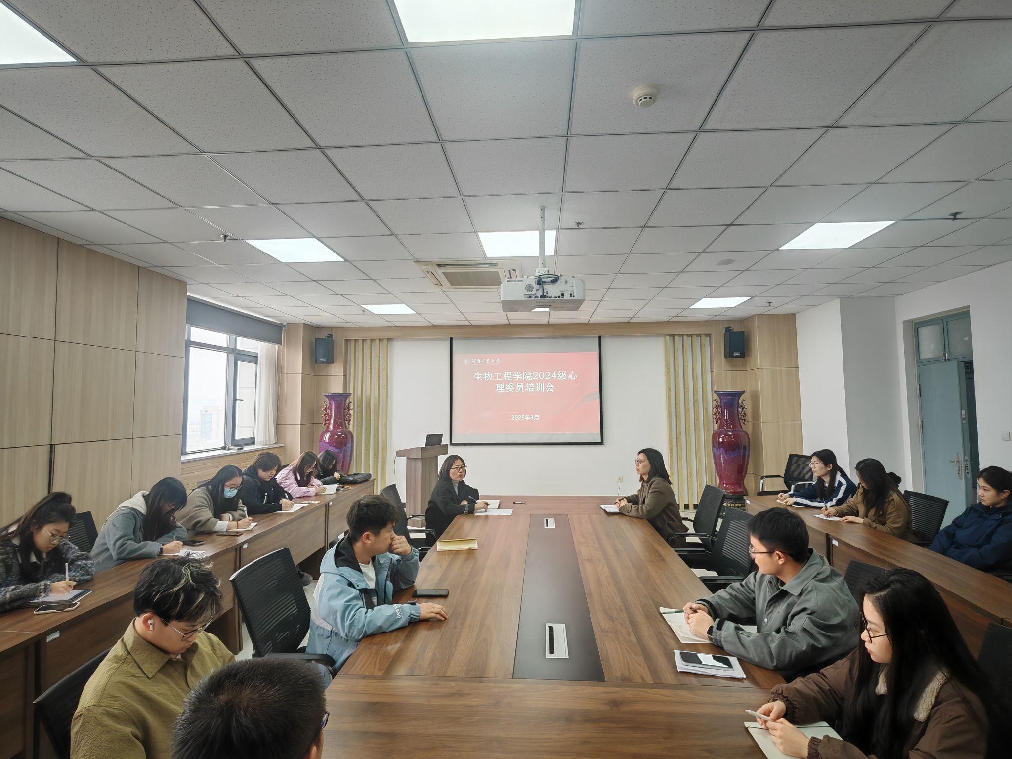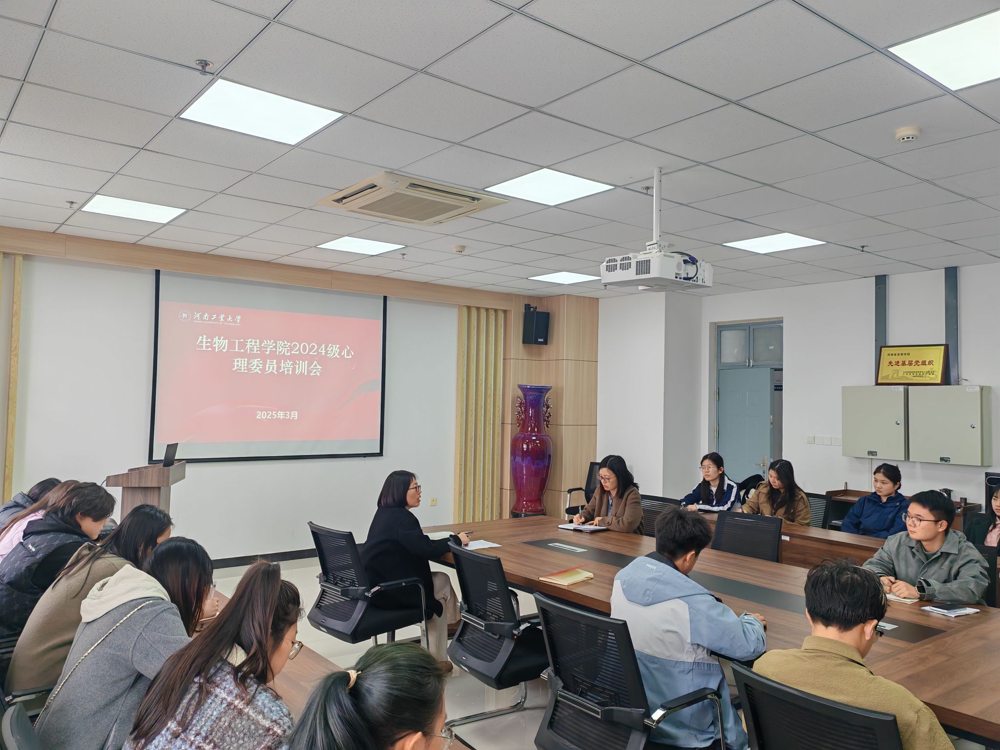 在基础实验实训楼1318会议室、1303心理咨询室开展了心理委员培训活动。本次活动由“心悦成长”心理工作室主持人李亚楠主讲,学院学工办主任岳媛媛、2024级全体心理委员以及工作室学生成员共同参与,通过理论讲解与实践体验相结合的方式,帮助心理委员们明确职责定位,掌握工作技能。