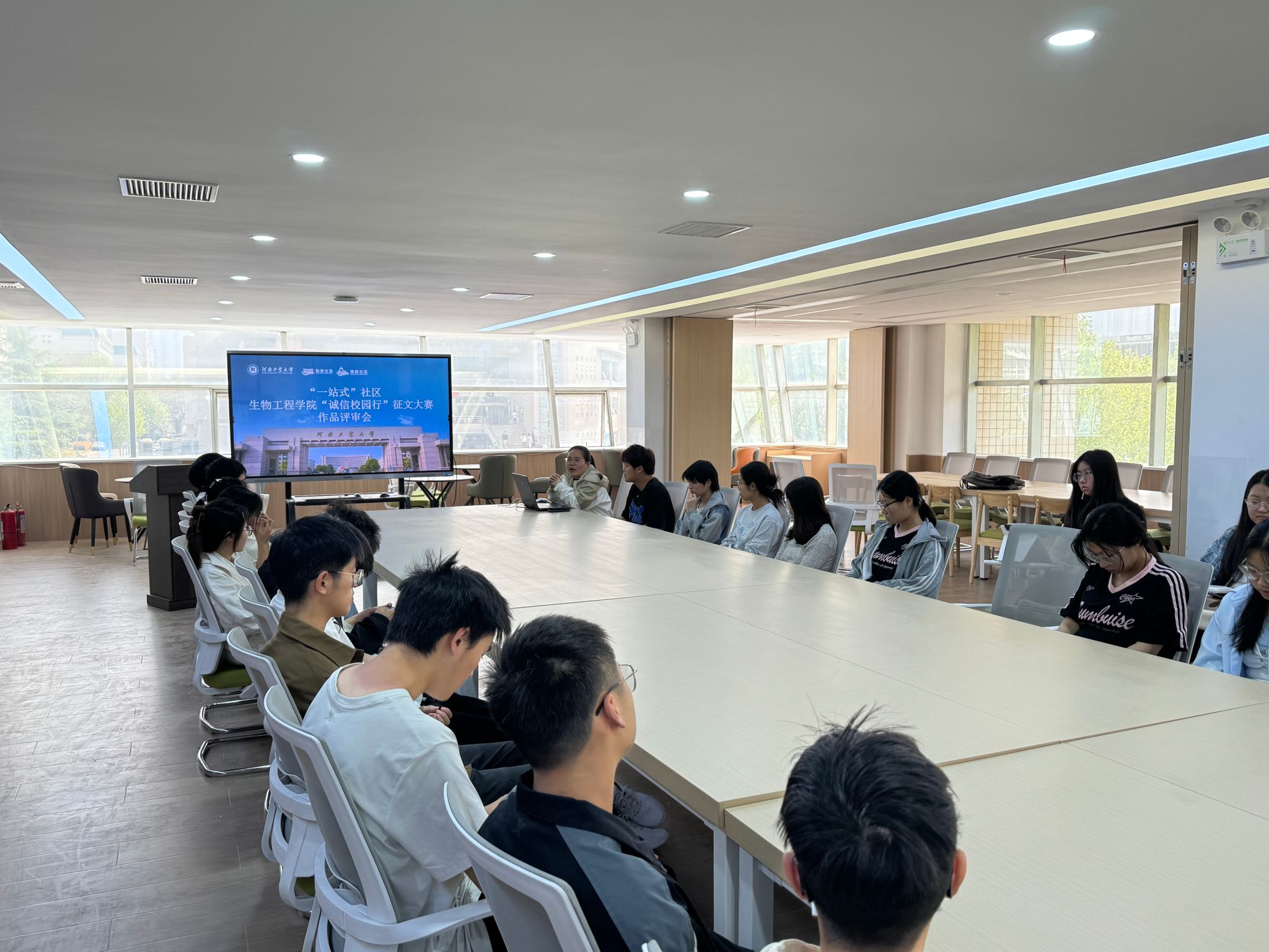 在德园“一站式”社区召开“诚信校园行”征文大赛作品评审会。学院资助工作负责人苏雪玲、资助助理、学生会代表以及参加本次征文大赛的同学参加了本次会议。会议由苏雪玲主持。