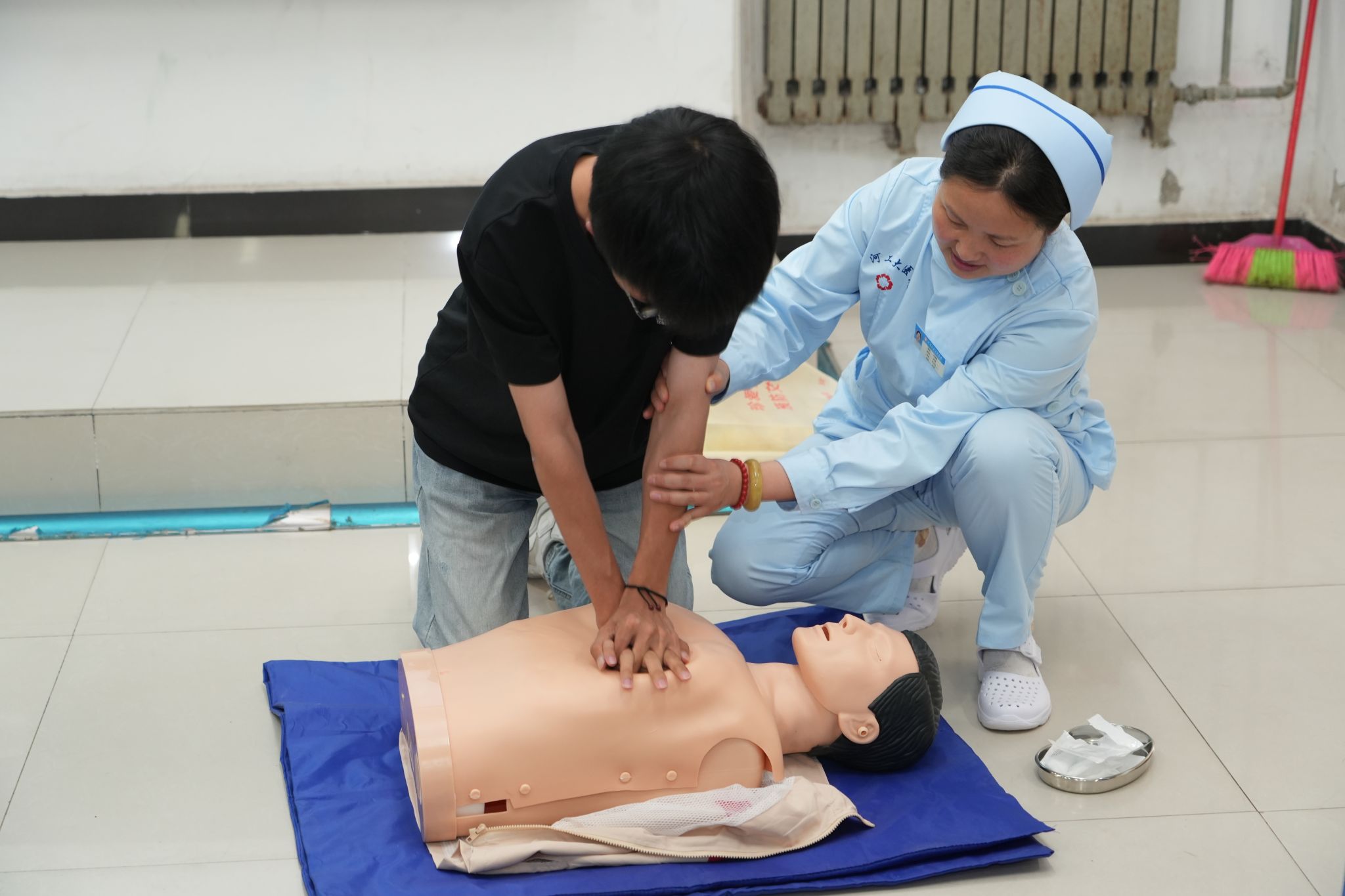 实操环节,齐丽丽详细讲解并展示了心肺复苏成人院外操作技术的操作流程。讲解演示后,同学们围绕人体模型进行心肺复苏技能练习,齐丽丽逐一指导,重点强调胸外按压的准确位置、力度和节奏,确保大家都能掌握正确的操作方法。参与活动的同学表示,“以前觉得急救知识很遥远,现在通过亲手实践,才真正明白了这些技能的重要性,以后遇到突发情况,我也有信心伸出援手了”。
