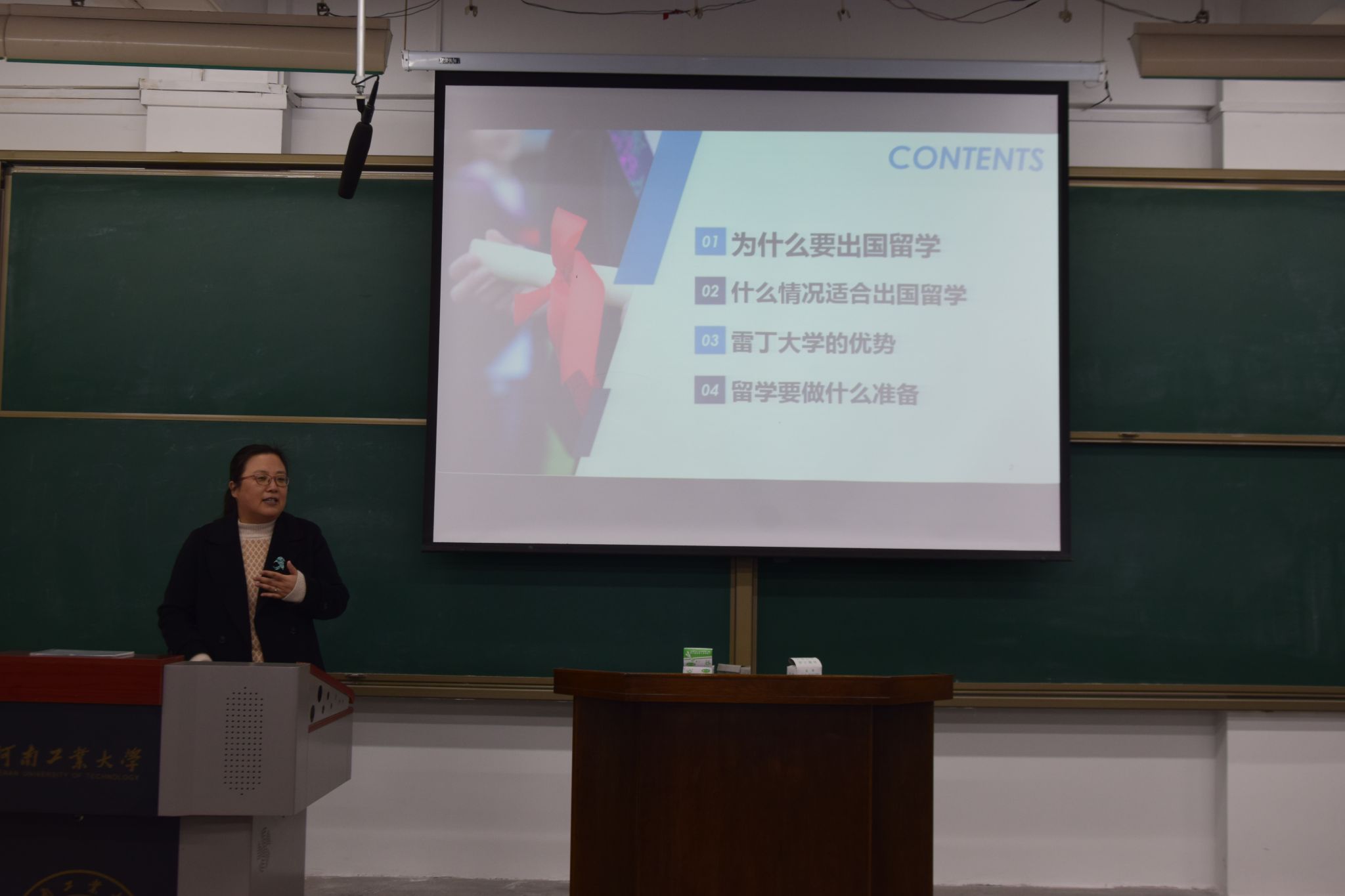 宣讲会上,赵红月从“为什么要出国留学”、“什么情况适合出国留学”及“留学要做什么准备”等方面为同学们做了详细的讲解,深入浅出地讲解了国内考研与国外留学环境、留学项目、留学申请的流程及注意事项等,让同学们对出国留学有了清晰的认识和规划。她结合英国雷丁大学成功案例,强调了留学规划的重要性,介绍了英国雷丁大学的校园环境、师资力量、入学条件和学费信息等,她用生动幽默的语言,帮助同学们增加对出国留学的认识。现场互动环节同学们积极提问,老师们耐心解答。