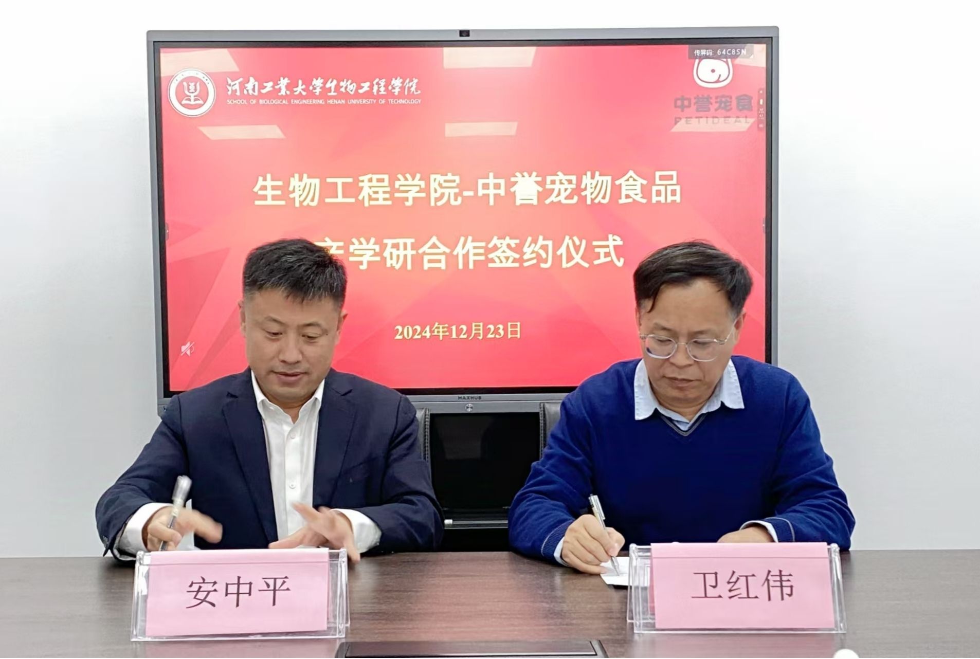 在与会人员的共同见证下,卫红伟和安中平共同签署了合作协议,卫红伟向中誉宠物食品(漯河)有限公司授“产学研创新实践基地”牌匾。会后,在汤化钢的带领下,与会人员参观了公司的现代化生产车间及产品展览区域。