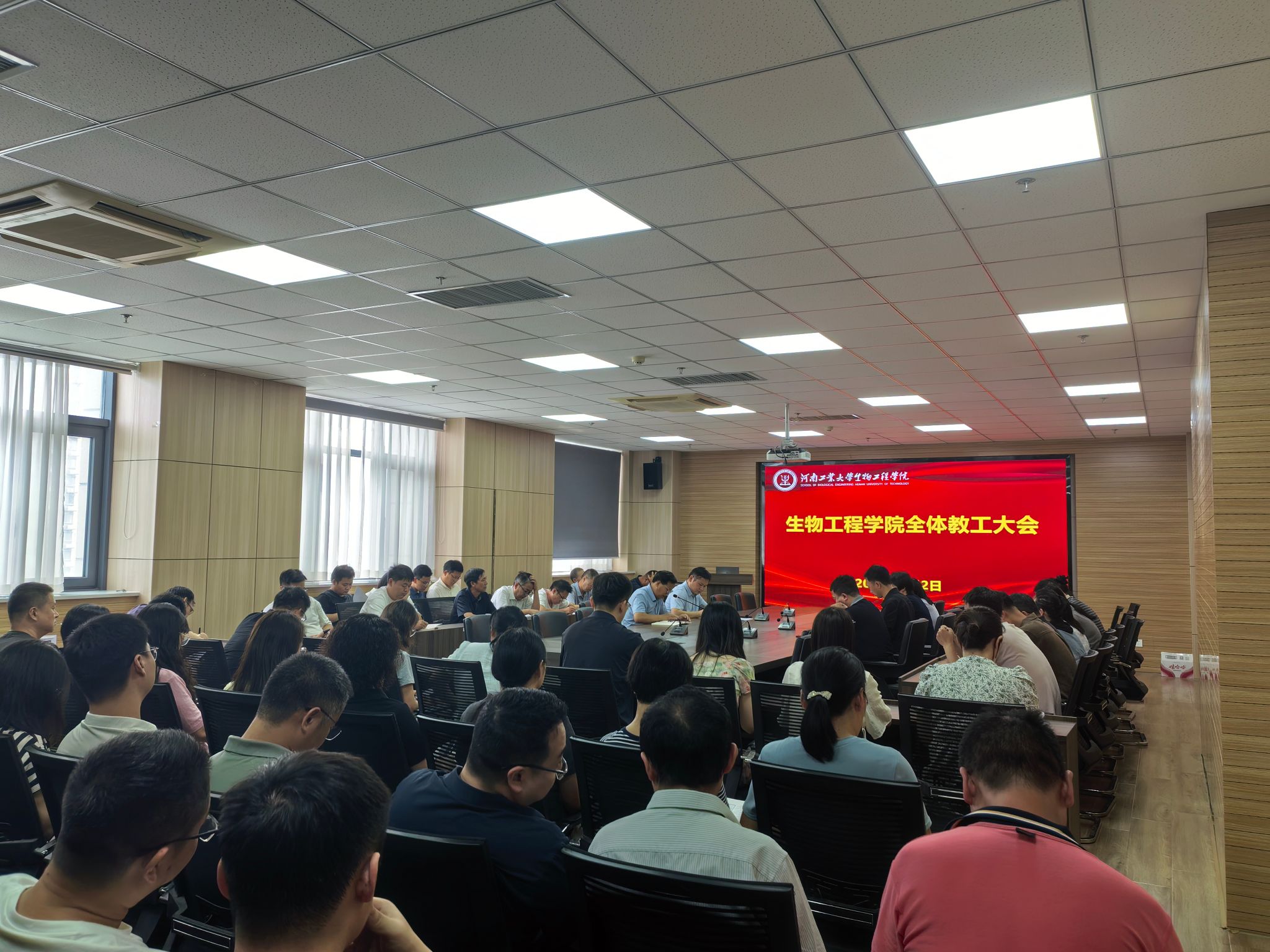 在惟德楼1313会议室召开全院教职工大会,学院领导班子成员及全体教职工参加会议。会议由学院党委书记卫红伟主持。