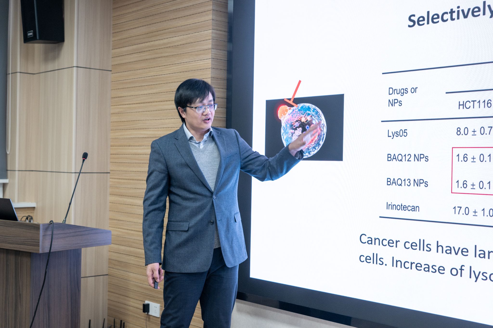 随后,Yuanpei Li博士作了题为“Transformative nanomedicine: from bench to clinic”的报告。Li博士介绍了其团队在智能纳米给药系统、癌症疗法和分子成像探针等方面的前沿进展。他重点分享了创新性纳米平台从实验室孵化到人体临床试验转化过程中的成功案例,突出展示了新型药物递送系统的优势。该系统能精准靶向癌细胞的溶酶体,巧妙抑制其活性,阻断自噬通路,大幅提升治疗针对性,且在临床前试验中证实安全有效。在他的领导下,多项纳米治疗候选药物已成功进入临床试验阶段,为肿瘤治疗和精准医疗的临床转化提供了坚实的支持。