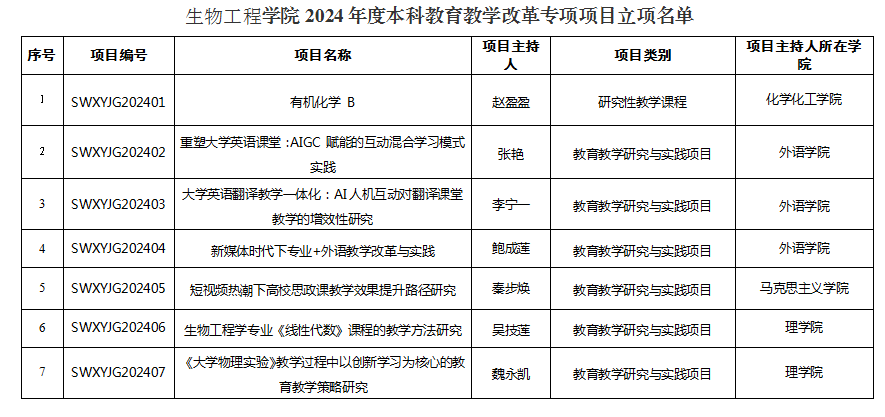 为全面贯彻落实立德树人根本任务,进一步提高学院本科教育教学质量,引导鼓励教师积极参加教学改革与研究,积极推进生物工程学院研究性教学工作,提升教师研究性课程建设能力和水平,培养学术型人才,根据《生物工程学院关于开展2024年度教育教学改革专项项目的通知》要求,经教师申报和学院组织评审,共有7项通过评审,同意立项。立项汇总表详见附表。