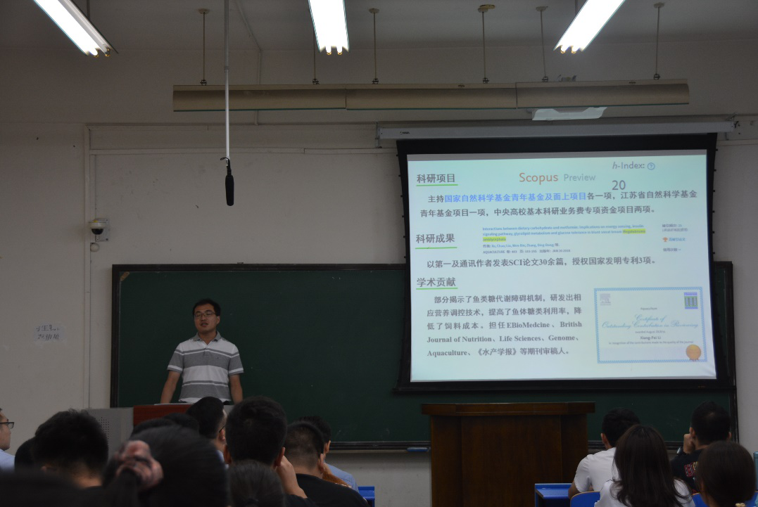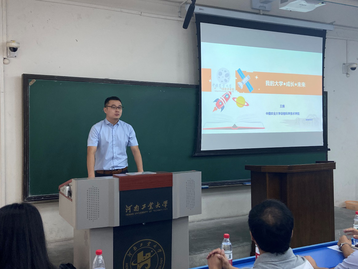 学院2008届毕业生、南京农大特种经济动物与水产系副教授李向飞从自己本科、研究生、访学和任教经历,讲述了一个自己与动物科学专业从相识到热爱的故事。在这个过程中,有过失落,有过迷茫,甚至有过堕落,然而凭着对生活和专业的热爱,他成功的走到了今天。李向飞老师还对动物科学就业、生活民生、国家战略等角度进行了剖析,结合饲料工业发展现状、饲料业产值、肉类和乳制品消费等现状,指出畜牧业具有广阔发展前景。最后从班主任角度给予新生建议,包括学习第一、丰富自己、树立目标和制定规划等方面。2008届毕业生、湛江市恒润机械总经理助理陈方来做了题名《饲料农牧行业近年来的发展及动物科学专业优势》报告,就个人工作情况、公司经营内容和经营情况进行简要介绍,并就当前我国农牧行业发展,尤其是饲料行业中数字型智慧工厂、养殖业发展趋势、动物科学专业优势和动物科学就业方向进行详细讲述,并结合自身经验给予宝贵建议。
