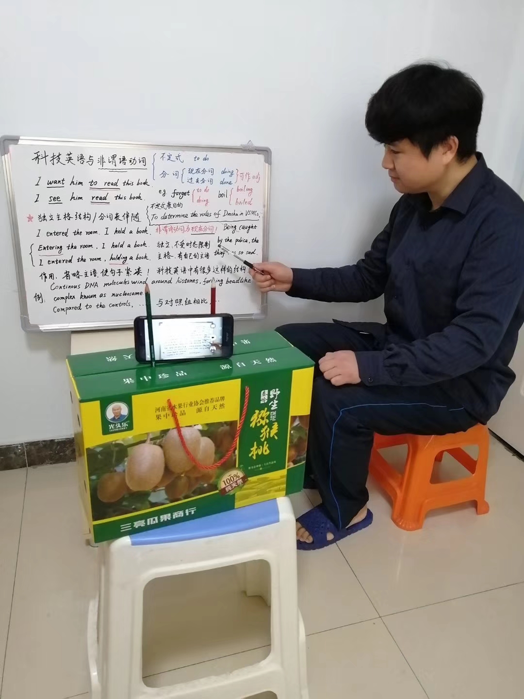 生物技术系范沛老师多措施并举,充分利用各种资源保障网上教学顺利进行,不断优化教学方式和教学效果。为了达到视觉效果最佳,首先要解决的是光线问题——视频要让学生能看的清楚,不能有阴影遮盖、不能留死角。于是范老师便经常性调整课程视频录制地点和角度,力争做到最优化处理。为了能够最大程度还原课堂教学情形,他自费购买教具,不计个人得失。考虑到多人同时在线造成的网络拥堵情况,他未雨绸缪,在学习群中提前将视频录制好并上传,方便同学们提前下载试看、预习,在上课过程中范老师时刻以学生为中心,及时为同学在线答疑解惑,保证学生上课过程顺畅、教学质量优质。