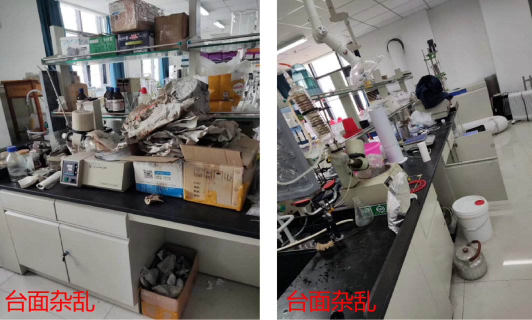 实验台面杂乱、无用泡沫箱未及时清理 |