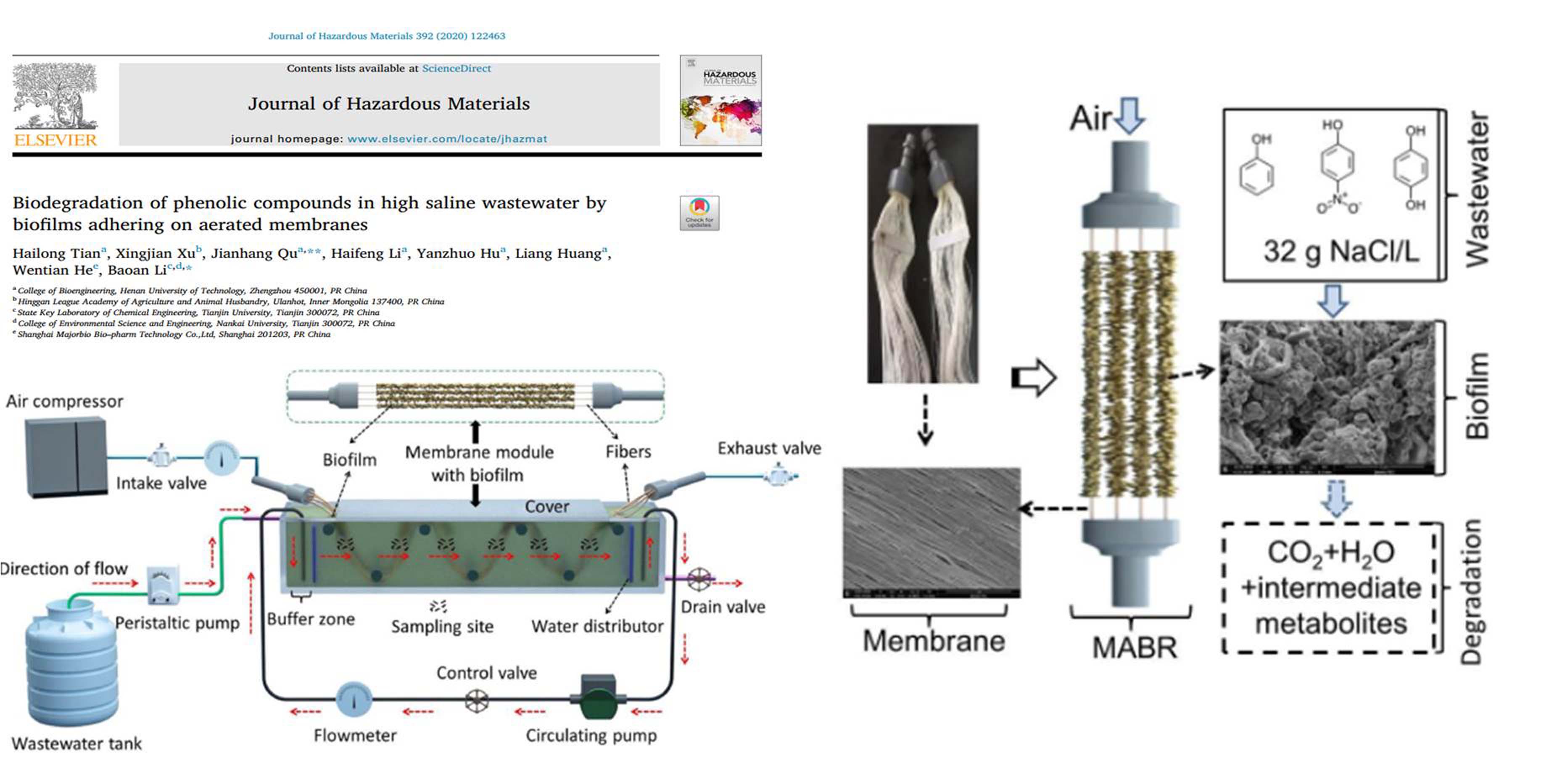 环境微生物技术团队成功设计出新型错流式膜曝气生物膜反应器集成系统,利用该型反应器在高盐度环境下实现了对强毒性含酚废水的生物强化降解去除。相关成果已发表在环境工程领域国际著名学术期刊Journal of Hazardous Materials(中科院JCR一区TOP,2020年影响因子IF=10.588)上。论文名称为:Biodegradation of phenolic compounds in high saline wastewater by biofilms adhering on aerated membranes。该成果的第一作者和通讯作者分别为田海龙副教授和屈建航教授。