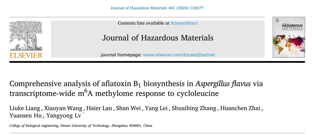 粮油食品微生物危害防控团队吕扬勇课题组在国际顶刊《Journal of Hazardous Materials》(中科院一区TOP,IF=13.6)上发表了题为“Comprehensive analysis of aflatoxin B1 biosynthesis in Aspergillus flavus via transcriptome- wide m6A methylome response to cycloleucine”的研究论文。该团队2021级硕士研究生梁柳柯为论文第一作者,吕扬勇为通讯作者,yanetfix