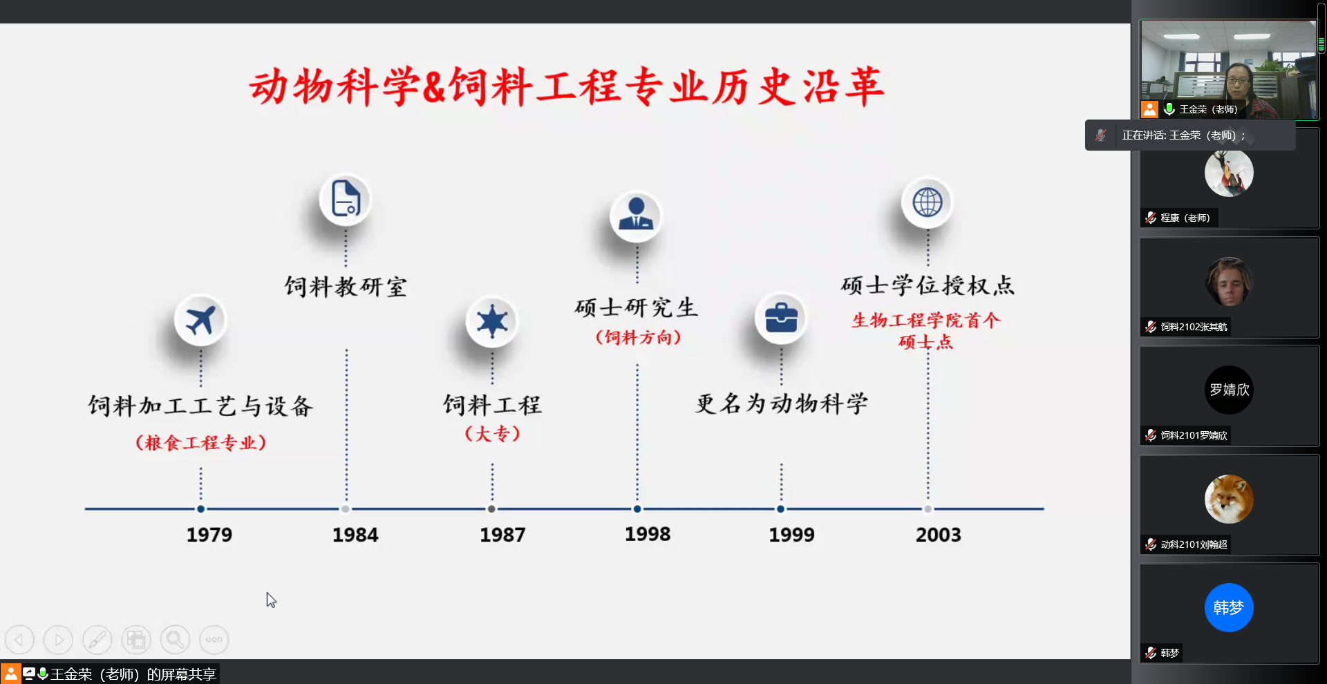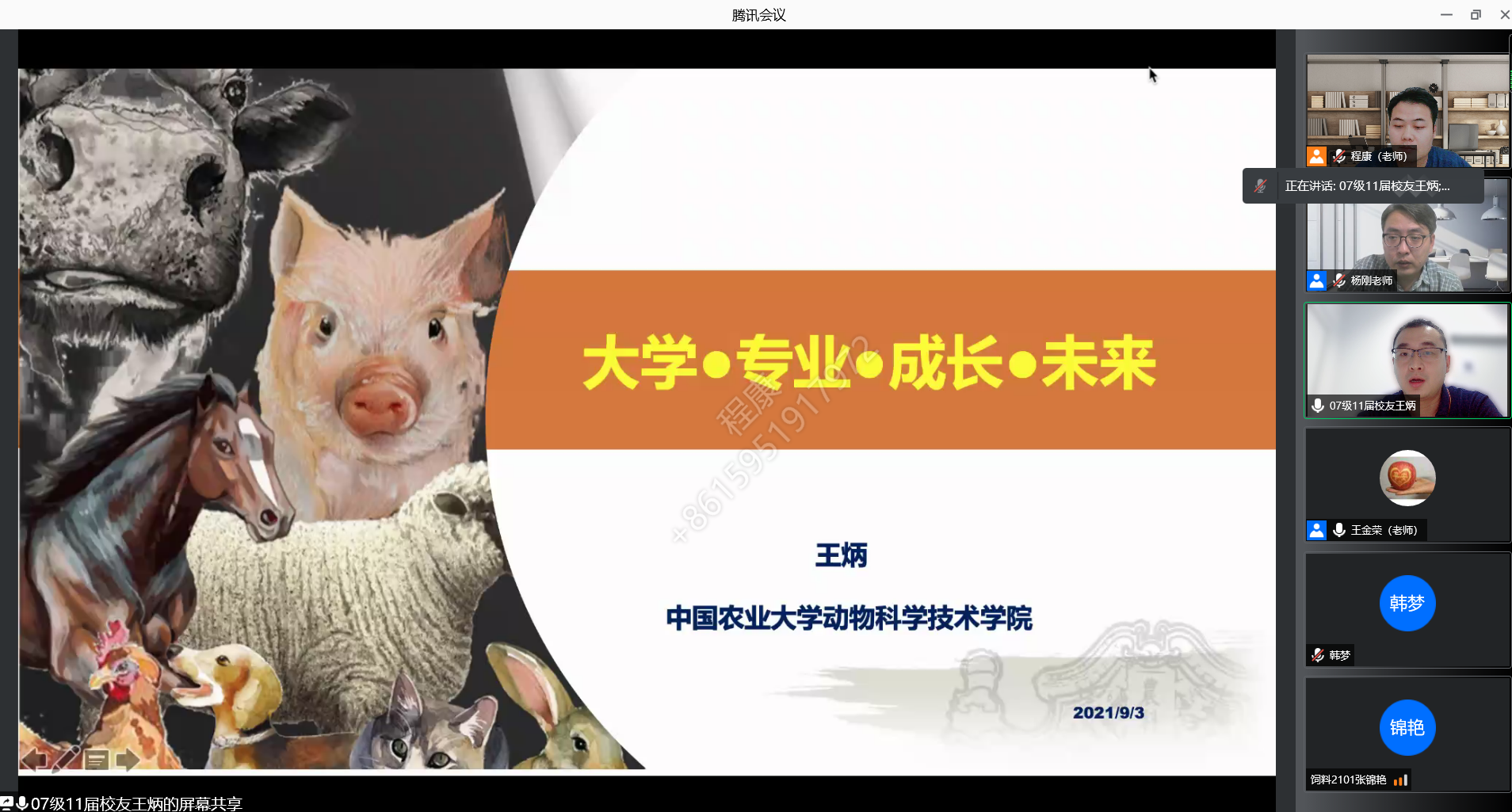 为加强21级新生对动物科学、饲料工程专业的了解,同时帮助新生尽快适应大学生活,9月3日至5日,动物科学系特别邀请优秀毕业生代表为21级新生作专业教育系列经验交流分享会。分享会以腾讯会议的方式举行,系主任王金荣教授主持,新生班主任及2021级全系本科生参加。