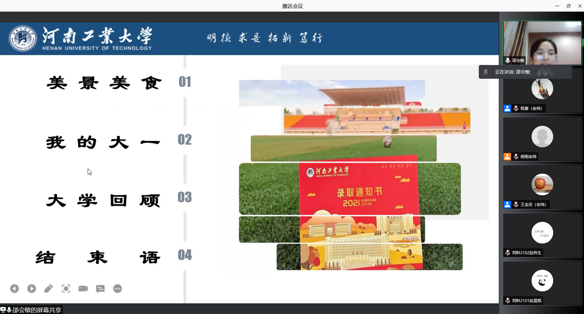 动物科学系2021届本科毕业生、中国农科院在读硕士邵会敏首先向新生们介绍了工大的校园环境,然后谈到自己在工大学习、生活的方方面面,希望同学们树立清晰目标,珍惜大学生活。