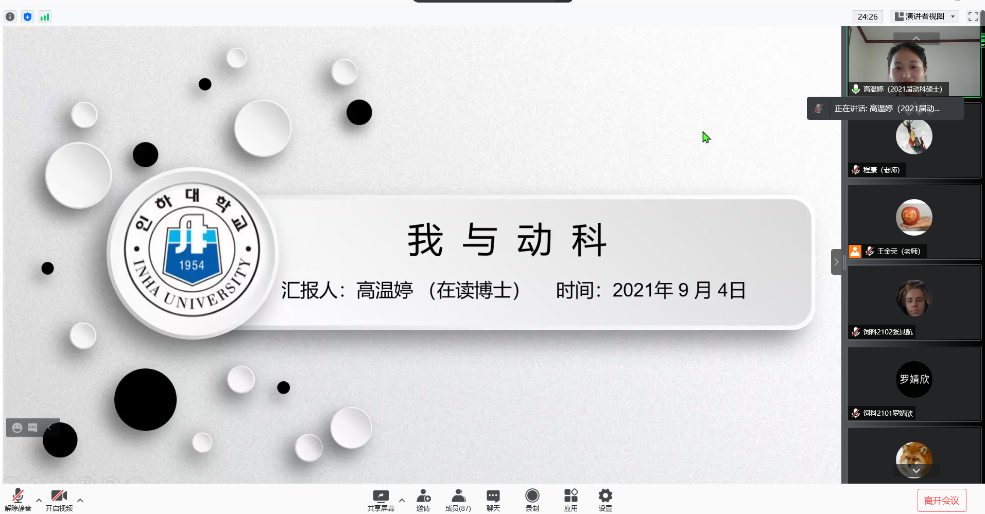 动物科学系2021届硕士毕业生、韩国仁荷大学在读博士高温婷结合自己求学历程,阐述了自己对动物科学专业的认知变化。通过自己的求职经历,她鼓励学弟学妹们,要树立专业自信。